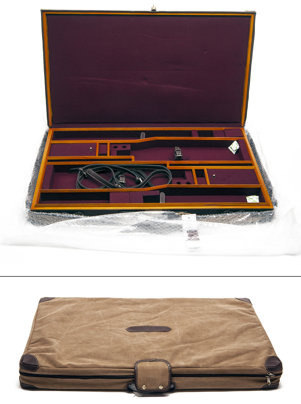 fitted 33in. over and under barrels, the interior lined with maroon baize, brass lock (including key), canvas outer