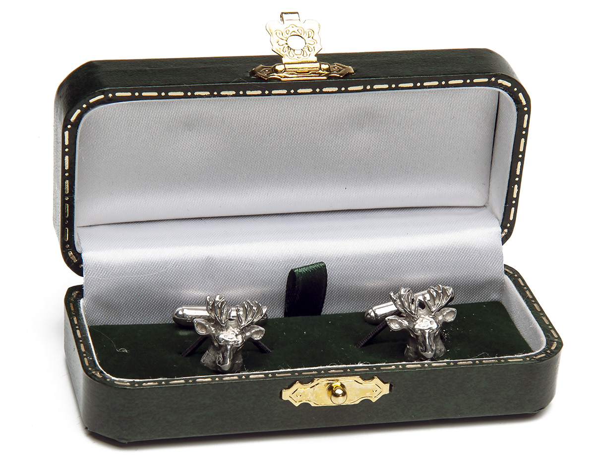 with 925 hallmarks dated 2009, solid bar links with stag heads, in their silk and green velvet green leather case
