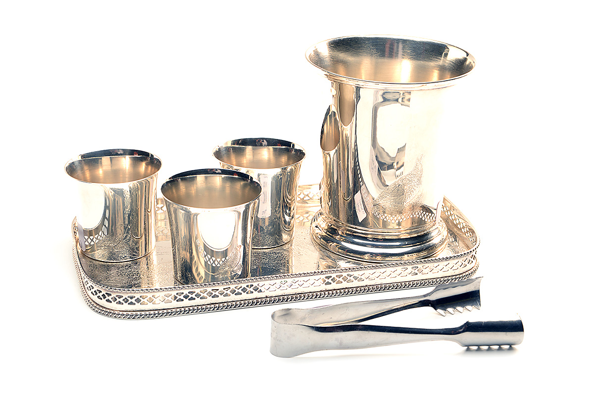 A COLLECTION OF 'THE FAMOUS GROUSE' SILVER-PLATED DRINKS SET, comprising of an ice-bucket with tongs, three cups and tray all with game scene, signed C. Stanley Todd dated 1985