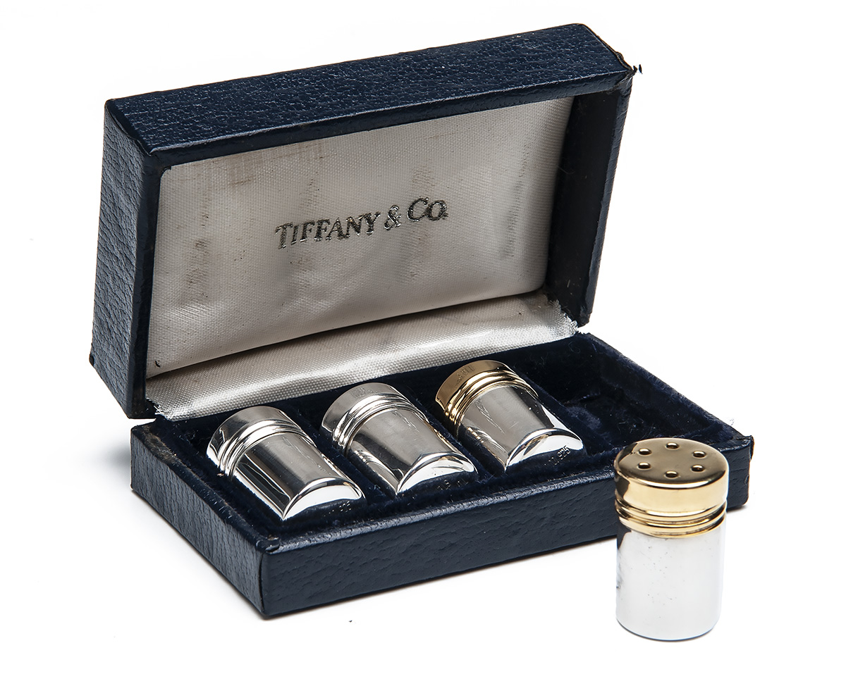 TIFFANY & CO. A SET OF FOUR STERLING SILVER SALT AND PEPPER MINATURE POTS IN THE FORM OF CARTRIDGES,