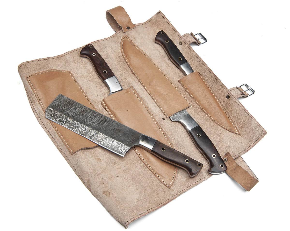 with a full assortment of chef's knives including paring knives, general purpose knives and a cleaver