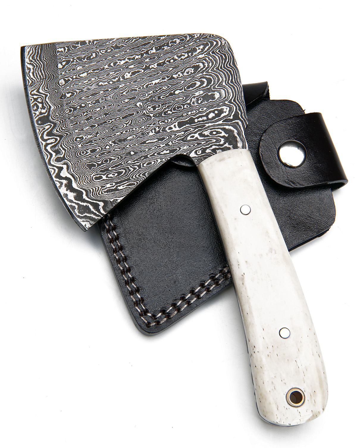 measuring 4in. from butt to bit, integral tang, mammoth grip scales bored with lanyard hole, including a leather blade cover
