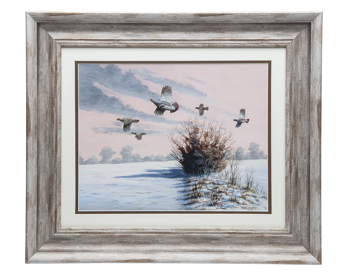 an original painting signed by the artist, showing partridges in flight in a winter setting, measuring approx. 20in. x 18in.