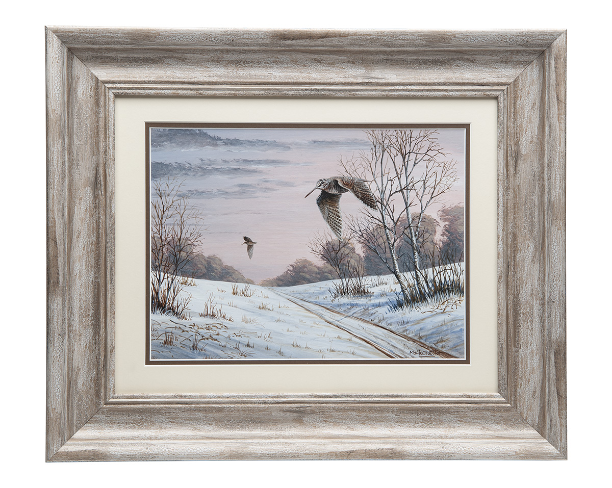 an original painting, signed by the artist, showing a brace of flying woodcock in a winter setting, mounted and glazed in a modern frame, measuring approx. 18in. x 16in.