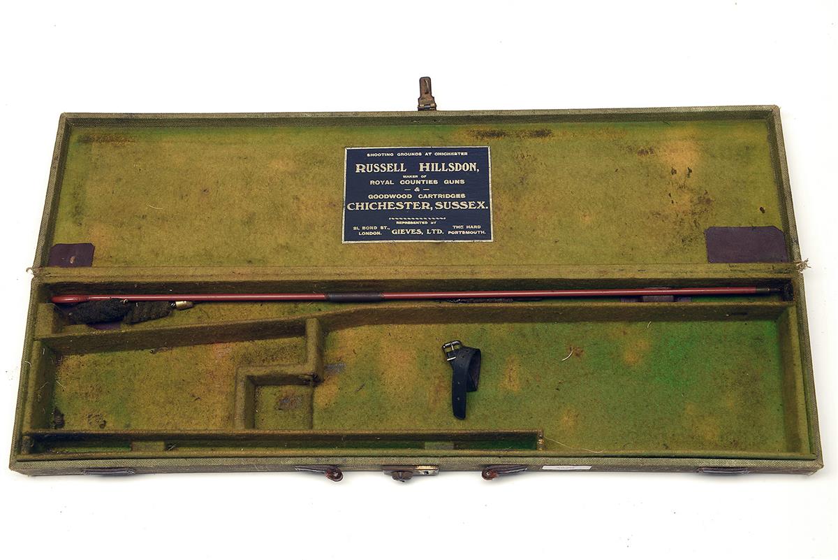 RUSSELL HILLSDON CANVAS GUNCASE, fitted for 28in. barrels, green baize-lined interior, missing straps and handle