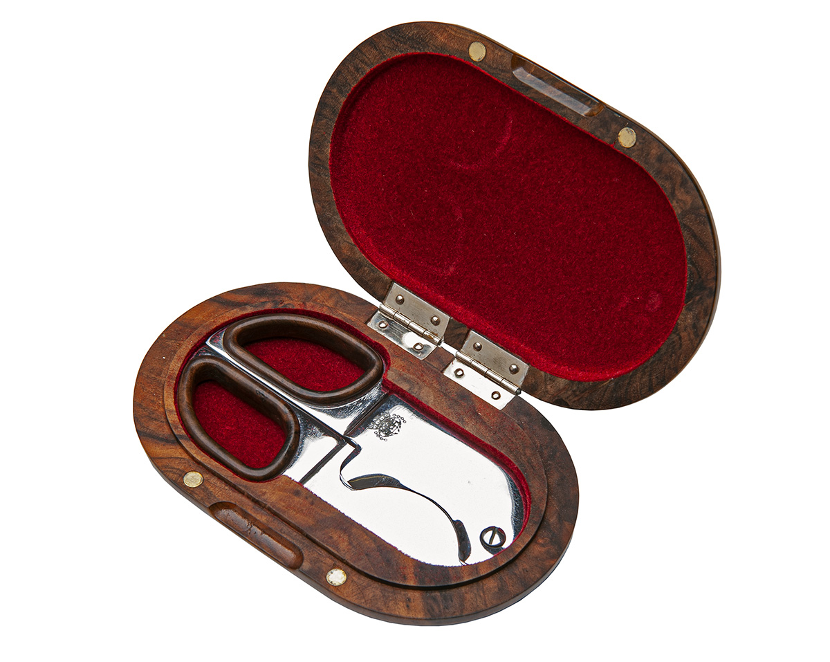 ovoid slim walnut case inlaid with the makers logo, red velvet interior, housing a steel 'scissor' cutter with walnut finger and thumb insert rings, velveteen pouch