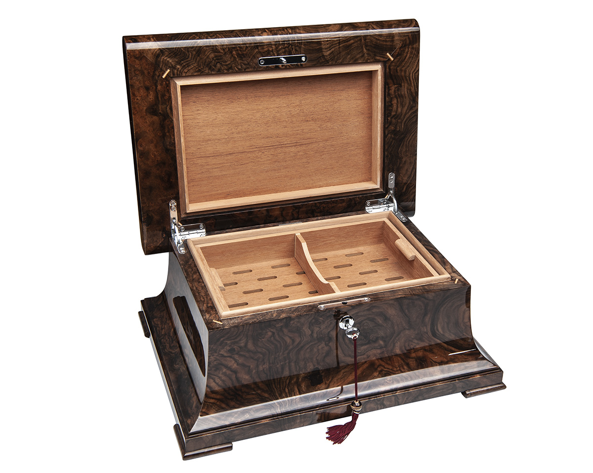 A NEW AND UNUSED BURL WALNUT HUMIDOR FOR SEVENTY-FIVE CIGARS,