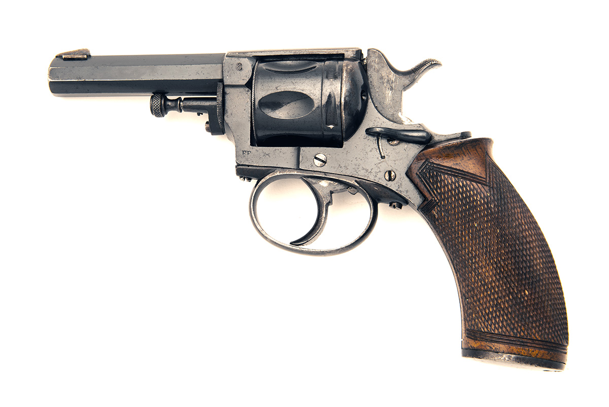 circa 1890, with blued octagonal 3in. barrel, swing-out ejector stored in the cylinder arbor, blued solid frame, blind fluted blued cylinder with coin-milled leading edge, double action mechanism with side safety, working replacement chequered walnut one-piece grip and iron butt-cap