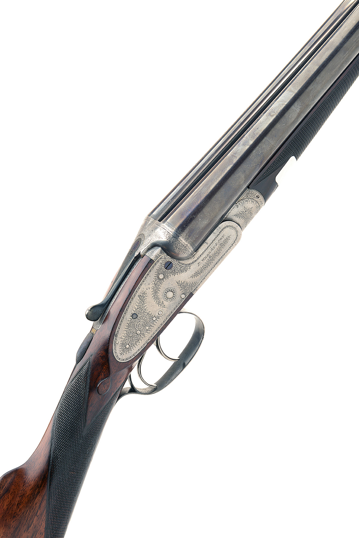 P. WEBLEY & SON 12-BORE SIDELOCK EJECTOR, serial no. 54233, 27in. replacement nitro barrels, the tubes engraved 'NEW BARRELS ESPECIALLY MADE FOR P. WEBLEY NO. 54233.', 2 1/2in. chambers, bored approx. 1/2 choke in both, automatic safety with gold-inlaid 'SAFE' detail, removable striker discs, border and partial acanthus scroll engraving, bright finish, 14 1/2in. stock (setting crack to rear of left lockplate) including 3/4in. rubber recoil pad, brass escutcheon marked 'T.W.T.I. (?)Xth REGT.', weight 6lb. 11oz.