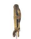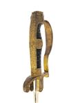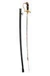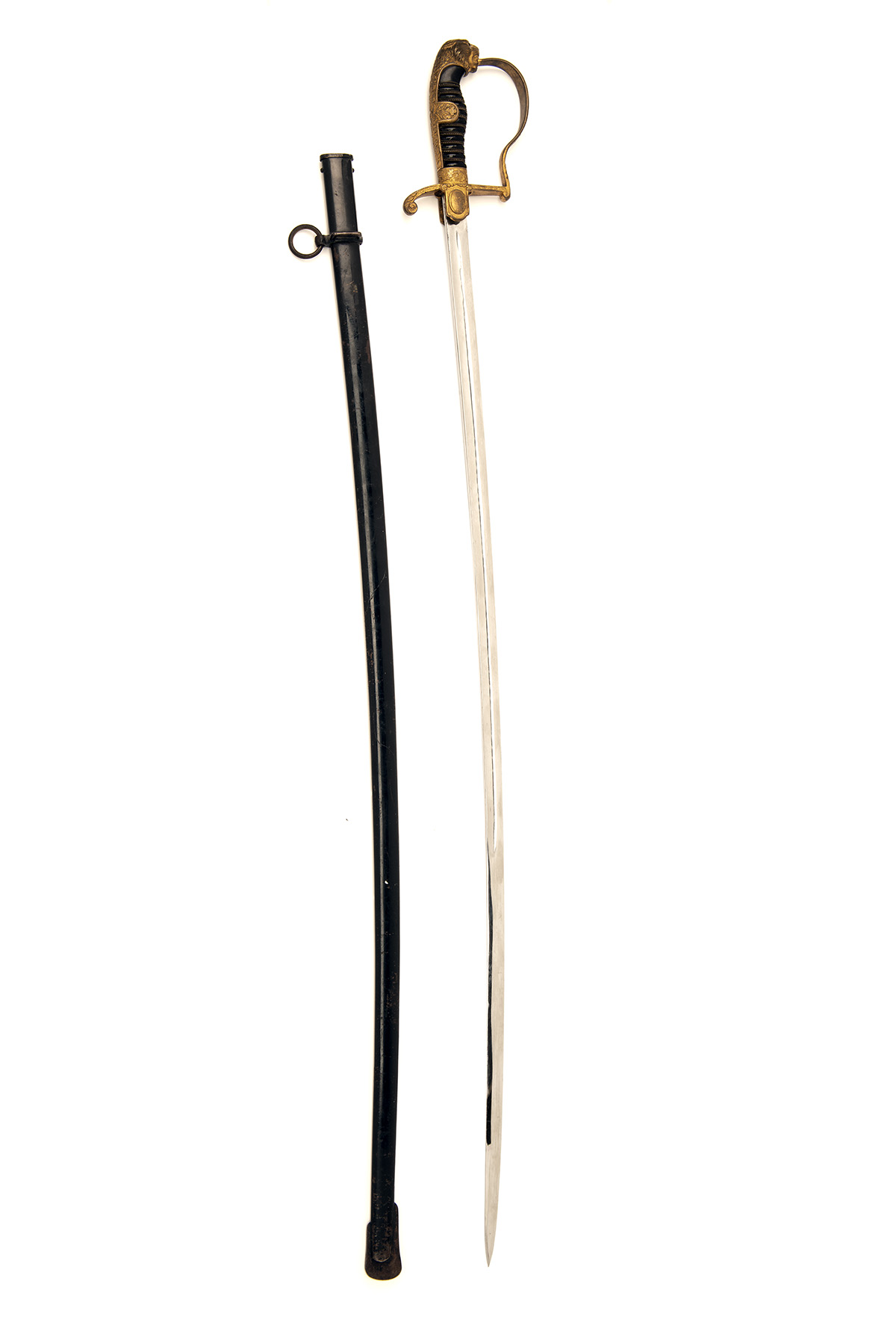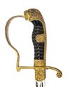 circa 1890, with plain narrow 35in. plated blade, broad fuller to both sides for the first two thirds of its length, makers mark at forte (obscured by the langet), cast and carved brass hilt with broad langets, one with crossed cannon the reverse with a vacant oval, rolled turned down quillion, 'P' shaped knuckle-bow, wire bound ribbed celluloid grip with lionshead pommel inset with red glass eyes, the backstrap, reinforcing ears and collar carved with oakleaves (strong traces of gilt remaining to brasswork) and complete with its black painted iron scabbard