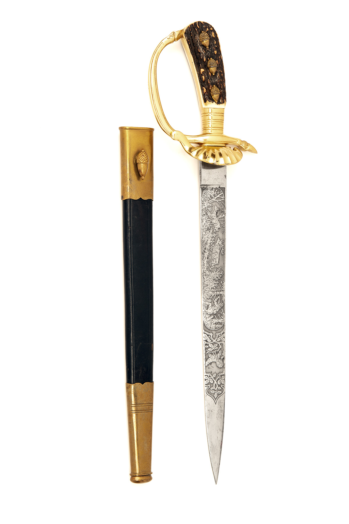with 13in. spear-point blade, false edged for the last 4in., both sides of the blade etched with woodland hunting scenes, the ricasso stamped 'ORIGINAL EICKHORN, SOLINGEN' together with a squirrel trademark, gilded 'D'-shaped alloy hilt with shell-guard and border-lined knuckle-bow, deer-foot terminal to the quillion, staghorn scales each with three applied acorn motifs (gilding worn on acorns, minor scuffs to shell, blade with slight stains); together with its brass-mounted black leather sheath, the mounts correctly stapled, the throat with 'acorn' frog button.
