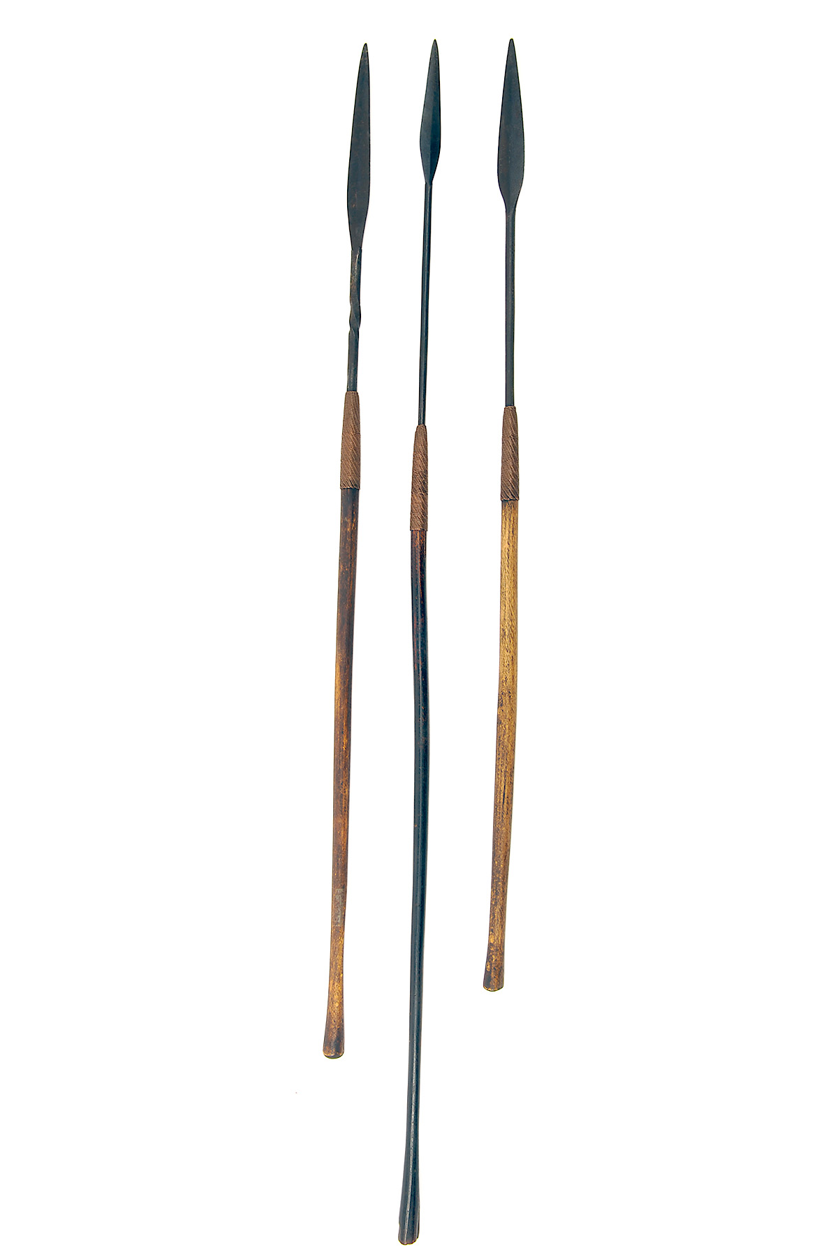 * THREE AFRICAN ASSEGAI SPEARS late 19th to early 20th century, all of similar form with narrow leaf-shaped blades copper wire bound to wood shafts with flared ends, the longest approximately 58in. overall (3)