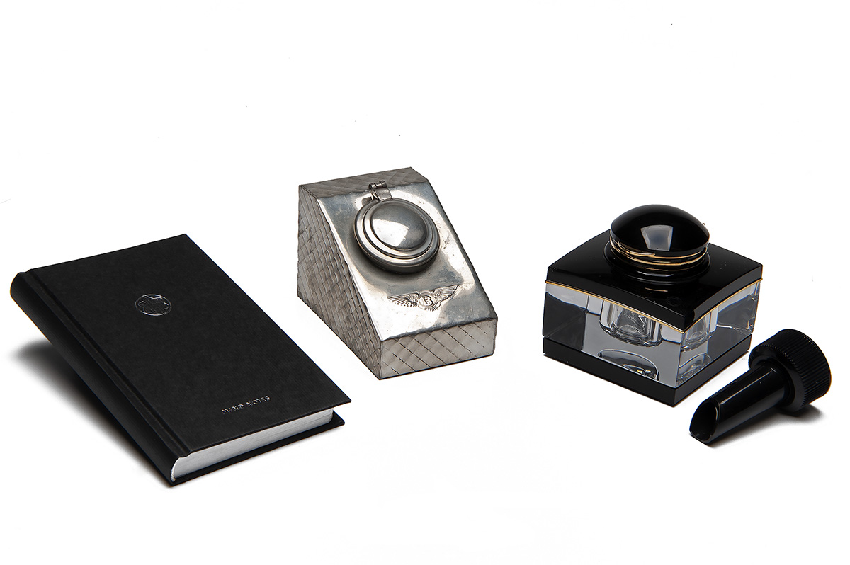 including a tinted glass Mont Blanc inkwell (Model 27100, ref. 13921) with pipette, a pewter inkwell embossed with the 'Bentley' motorcar emblem (believed manufactured by Stride & Son) and a Mont Blanc notebook model 9527, appearing unused in their respective manufacturer's card cartons (some storage markings)