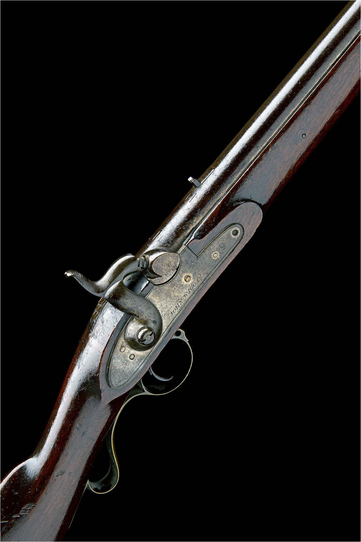 circa 1842, with round 33in. barrel, block and blade fore-sight, standing notch rear-sight, the barrel marked with London proofs, plain top-tang marked '12', borderline engraved lock of flintlock form signed 'JOHN WIGGAN' and stamped '9', walnut full-stock, the butt stamped '9' on the right and with a large crown over 'F' stamped on the left, brass furniture, the lower tang with finger spur, two barrel keys, Hanoverian bayonet catch and iron ramrod