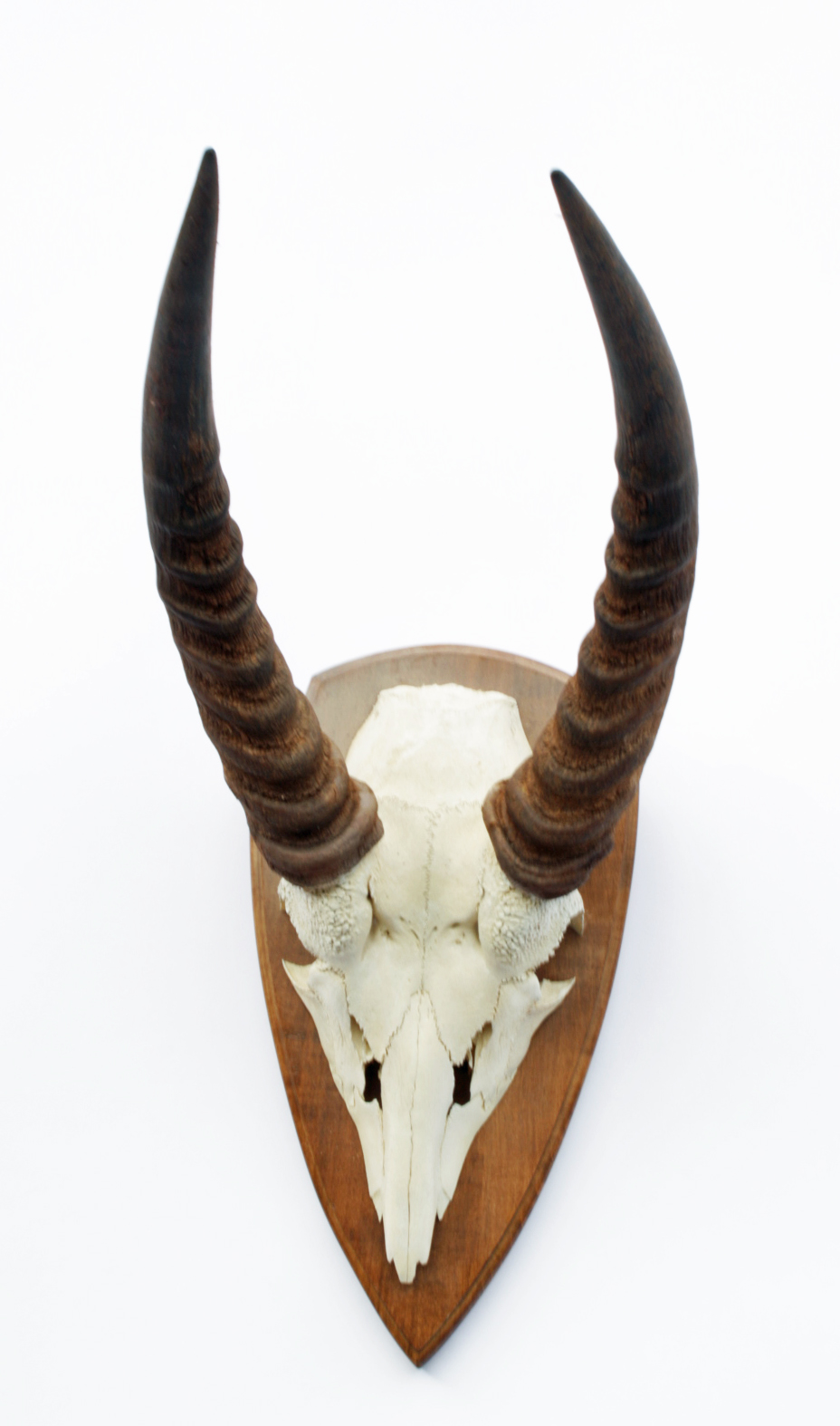 A SKULL MOUNT OF A WATERBUCK, mounted on a wooden plaque