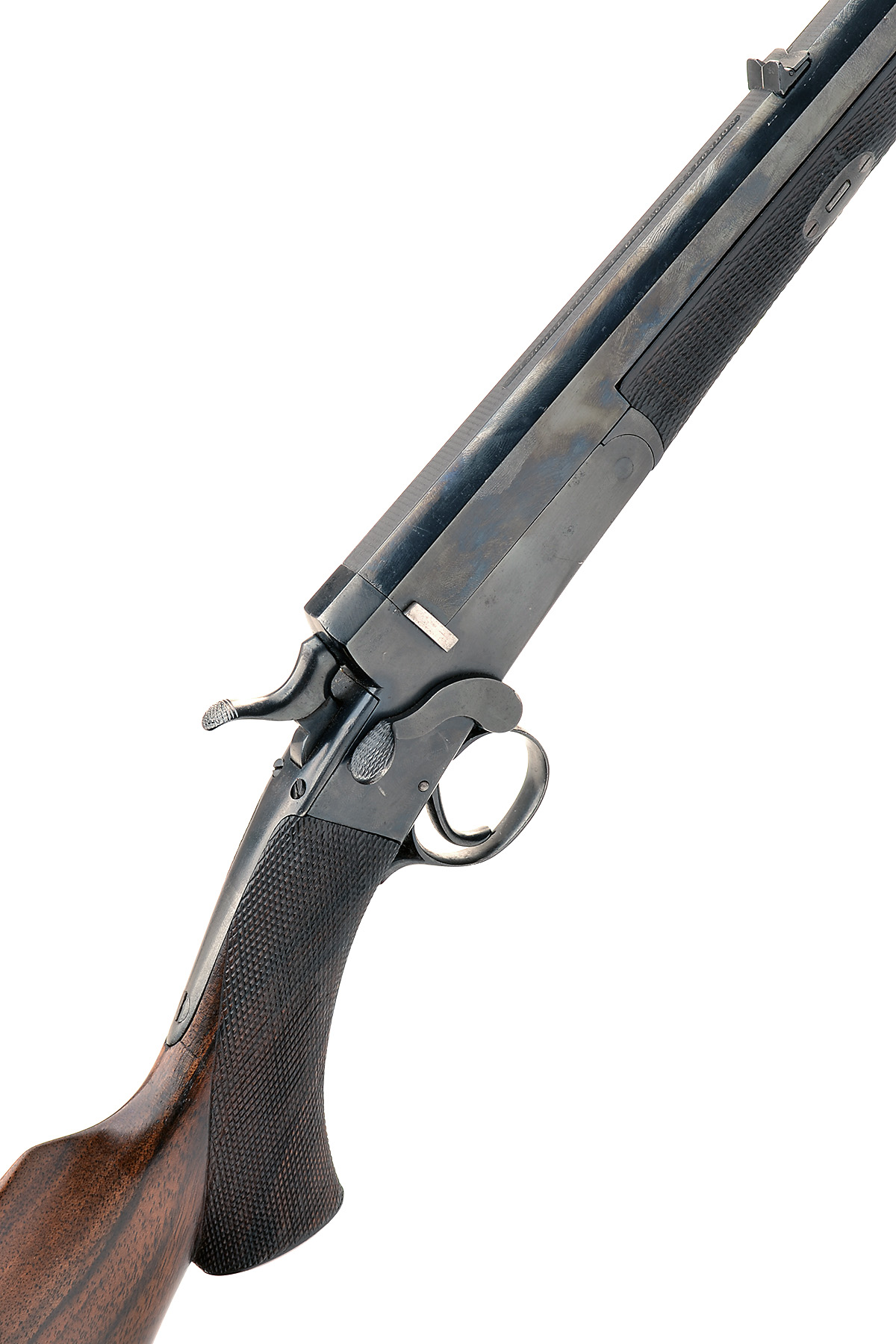 Wm. MOORE & GREY .360 NO.5 (ROOK) SIDELEVER HAMMER ROOK RIFLE, serial no. 17593, 26in. octagonal black powder only barrel, with matted sight flat engraved 'Wm. MOORE & GREY. 43. OLD BOND ST. LONDON.', standing notch rear sight with one folding leaf, marked for 50 and 100 yards and with silver sight lines, dove-tailed bead fore-sight, plain blacked action, non-rebounding central hammer, the whole retaining much renewed black finish, 14 1/2in. figured pistolgrip stock (cracked at head), with steel buttplate and steel pistolgrip cap, splinter fore-end with cross-pin release, weight 5lb. 14oz.