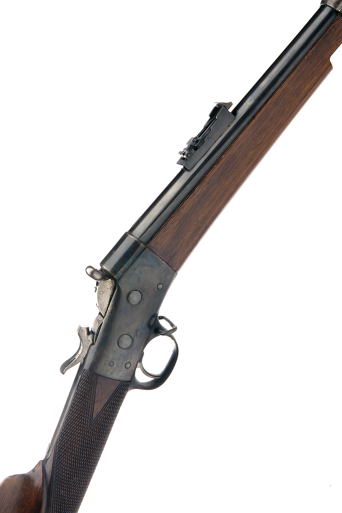 A 12.5mm (SWEDISH) RIFLE SIGNED HUSQVARNA, MODEL 'DELUXE ROLLING-BLOCK', no visible serial number, with blued and sighted 37 1/2in. barrel, colour hardened radiused action with central hammer and rolling breech (both currently frozen), chequered walnut butt-stock with raised cheek-piece, three-quarter length fore-end, three barrel bands and bayonet lug