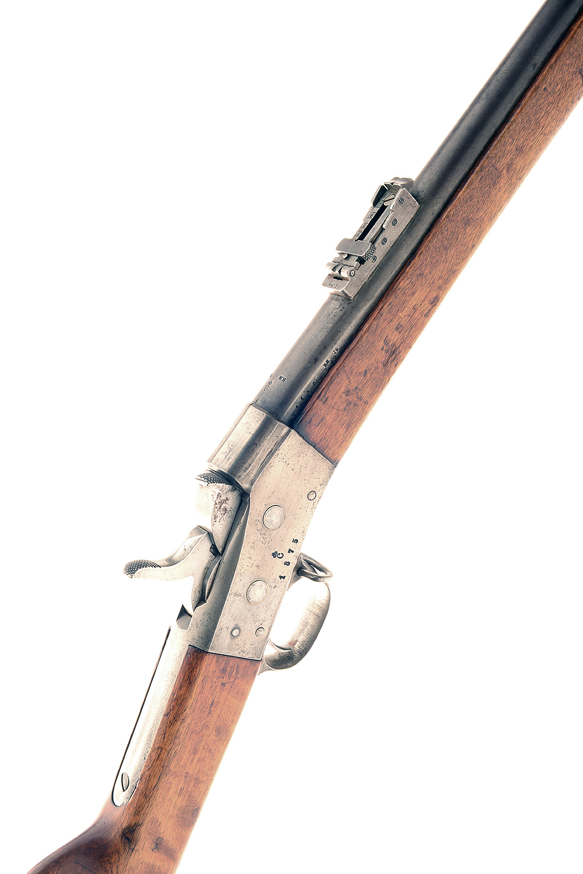 A 12.7mm x44R (SWEDISH) SINGLE-SHOT SERVICE-RIFLE MODEL REMINGTON ROLLING BLOCK SWEDISH CONTRACT, serial no3372, dated for 1875, with 37 1/4in. sighted barrel, rolling block action , walnut butt-stock and full-length fore-end with three iron barrel-bands and bayonet bar, including clearing rod
