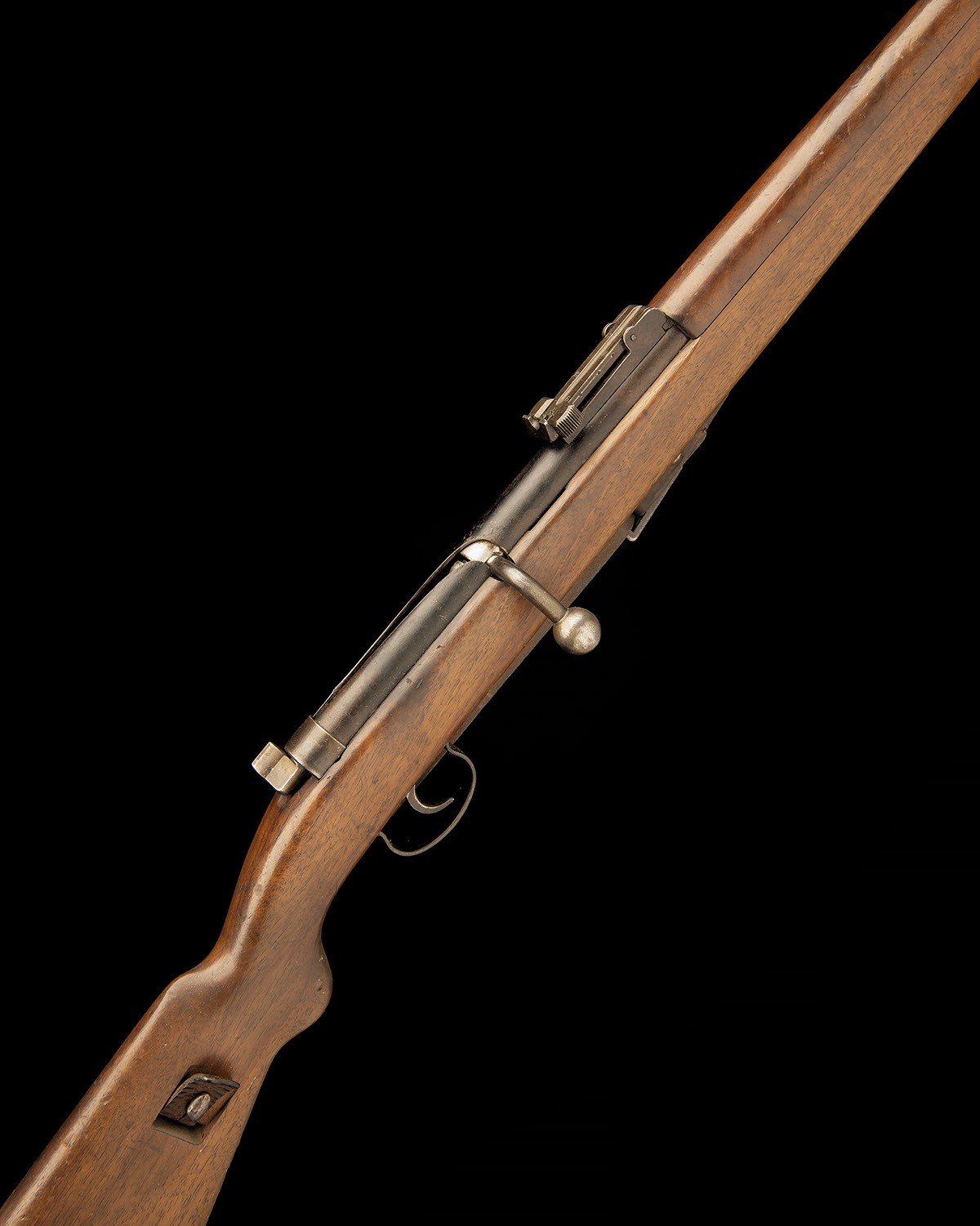 circa 1938, with concealed, sighted barrel, dove-tailed ramp and blade fore-sight, military pattern rear-sight graduated to 12 metres, loading aperture to top of fore-stock, bolt-action cocking, wing safety to end of receiver, walnut three-quarter stock of military style with half-pistol grip (marked with serial no.) and including a period leather sling, the whole in imitation of a German Mauser K98K service rifle complete with blacked steel furniture and provision for an under-barrel clearing rod (missing), action weak