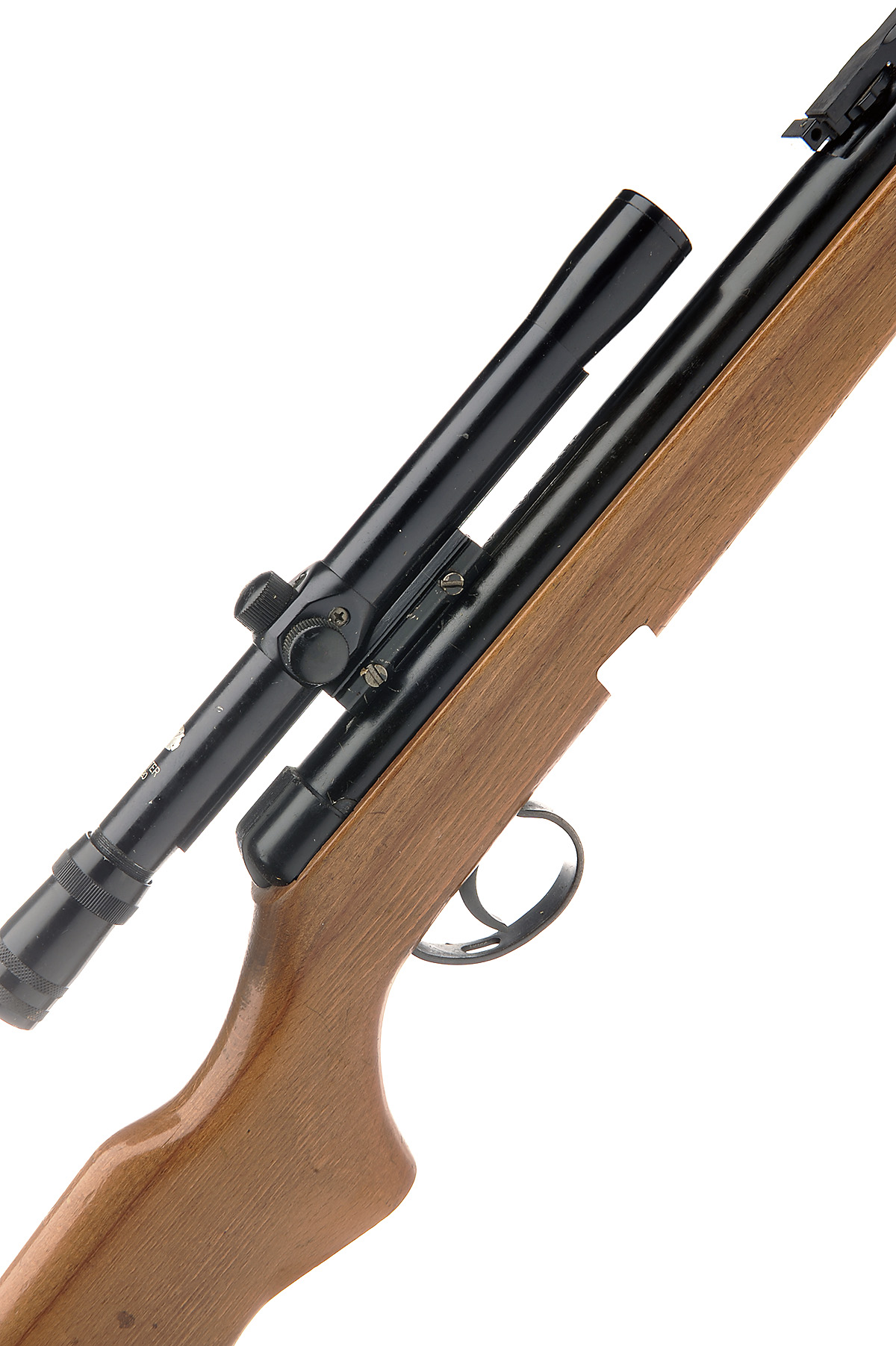 third series, with stove enamelled 18 1/2in. barrel, stove enamelled air-chamber (requires seals) and beech half-stock, fitted with a period HUNTER 4x20 telescopic sight, rear-sight at fault otherwise generally collector's condition