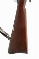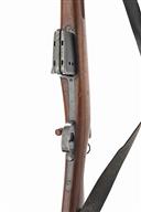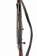 with blued 30 3/4 in barrel, block and blade front-sight and quadrant rear-sight, fluted receiver with toggle-handled straight pull bolt, ring safety to rear and box magazine, regulation iron mounted full walnut stock with two barrel bands, all matching numbers and complete with original brown leather sling and sight cover.