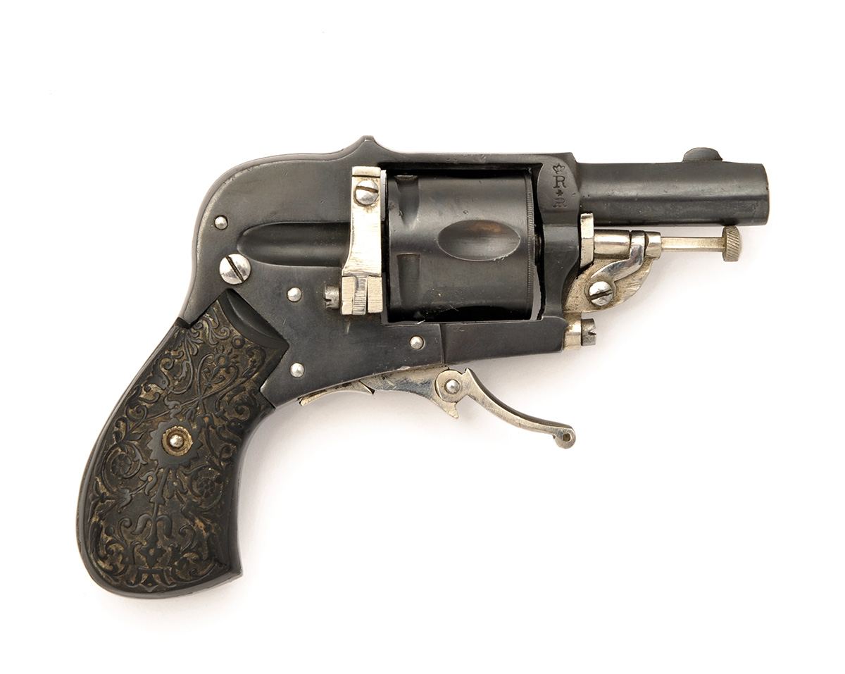 Belgian circa 1890, with 1 3/4in. ovoid barrel, solid frame with side safe, blind fluted cylinder,concealed hammer and double action folding trigger, fitted with florally embossed hard rubber birdshead grips, much finish remaining
