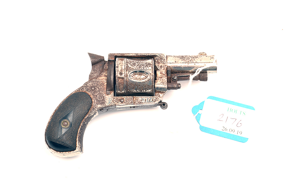 Belgian circa 1885, with 1 3/4in. ovoid barrel, engraved solid frame, blind fluted engraved cylinder,exposed hammer and single action folding trigger, fitted with chequered hard rubber birdshead grips, traces of plated finish remaining