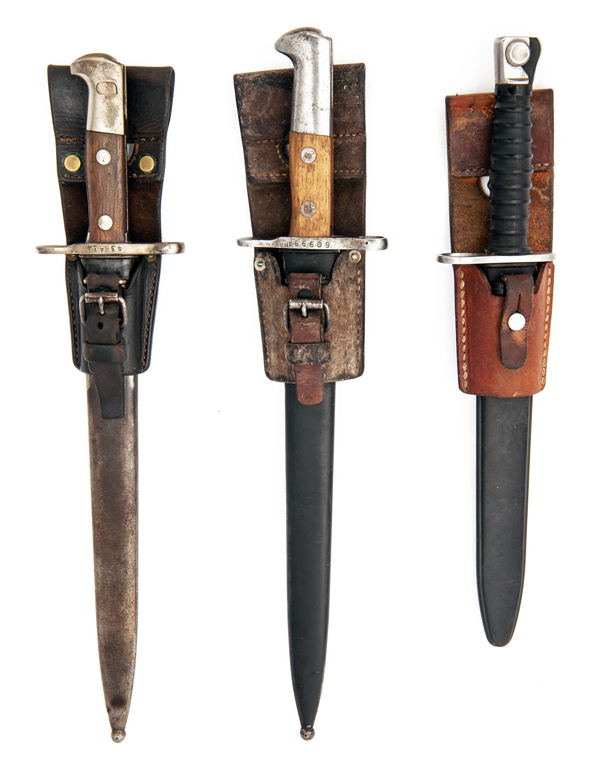 ** A SELECTION OF THREE SWISS BAYONETS including a dagger bayonet for the K11/K31, a knife bayonet for the same model rifles and a dagger bayonet for the STGW57, all with scabbards and frogs (3)
