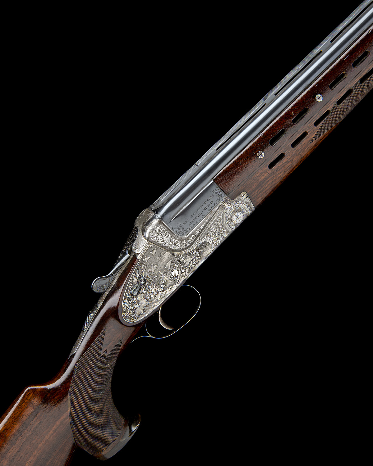 29 5/8in. (76cm) nitro reproved (in 2019) barrels with 9mm ventilated matt rib, bead fore-sight removed and high-vis sight fitted, intermediate bead fore-sight, 2 3/4in. chambers, bored approx. full choke in both, three-piece ventilated fore-end, hold-open toplever, manual safety, hand-detachable lockplates with cocking-indicators, gold-washed single-trigger, bold Germanic scroll engraving on a matted background, the lockplates carved in relief with game scenes of hound and fowl, old silver finish, 14 1/4in. pistolgrip stock including 5/8in. ventilated rubber recoil pad, horn pistolgrip cap, weight 7lb. 15oz.