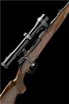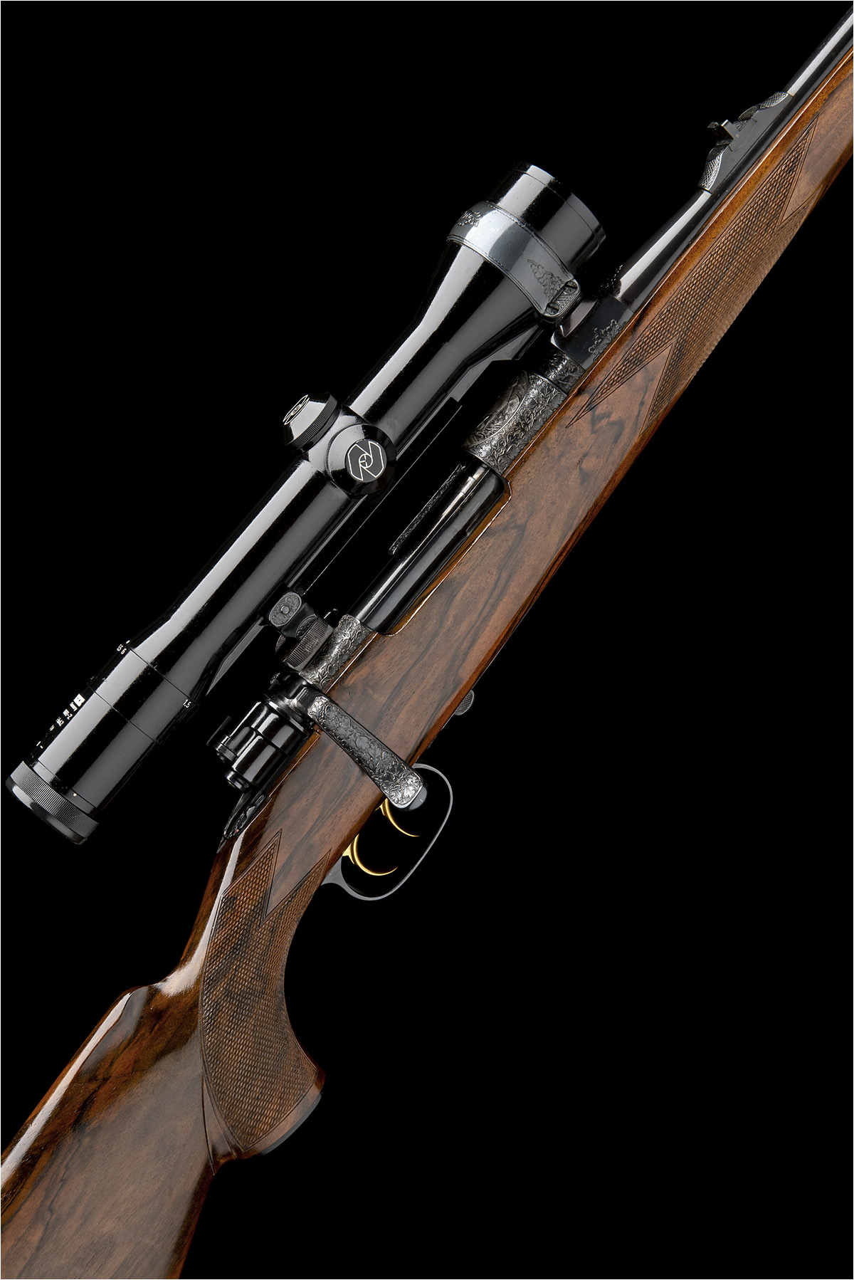 25 5/8in. nitro barrel with open sights and ramp-mounted bead fore-sight, the receiver (with thumb cutout) mounted with a Zeiss Diavari-Z 1,5...6x42 T* telescopic sight, serial no. 1917651, in engraved quickly-detachable mounts, hinged floorplate with lever release, gold-washed double set triggers, the receiver, bolt handle and furniture profusely engraved in relief with oak leaves and acorns on a matted background, the receiver ring carved with a vignette of a lone mouflon, the floorplate with a barking stag, well-figured pistolgrip stock with cheekpiece, pistolgrip-cap, sling swivels, 14 1/4in. pull including 1/2in. rubber recoil pad, weight 8lb. 4oz. (unscoped) and 9lb. 12oz. (with scope)