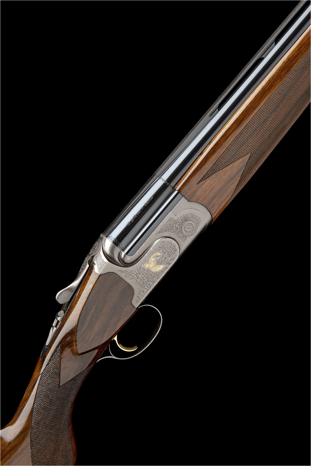 28in. nitro barrels with 7mm ventilated matt top-rib, 3in. chambers, multichokes (with spares), hold-open toplever, manual safety with integral barrel selector switch, gold-washed single trigger, floral scroll engraving surrounding gold-highlighted game scenes, 14in. semi-pistolgrip stock including 3/4in. ventilated rubber recoil pad, weight 7lb. 3oz., in its makers universal case