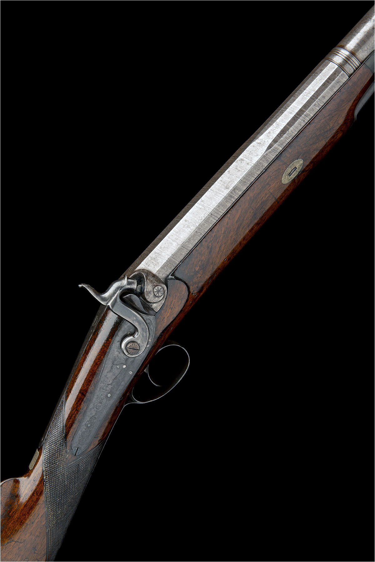 circa 1855, with heavy 37 1/2in. octagonal to sixteen sided to round barrel, carved band at the intersection, the top flat at breech signed in script 'COX YEOVIL', bead fore-sight, scroll engraving to breech end and top-tang, carved snail with engraved plug, border engraved back action lock signed 'COX' and featuring a standing pheasant and further scroll engraving, plain probable replacement hammer, walnut half-stock chequered at the wrist and with moulded side-cheek, iron furniture, horn fore-end cap and plain thimbles for the under-barrel brass tipped ramrod