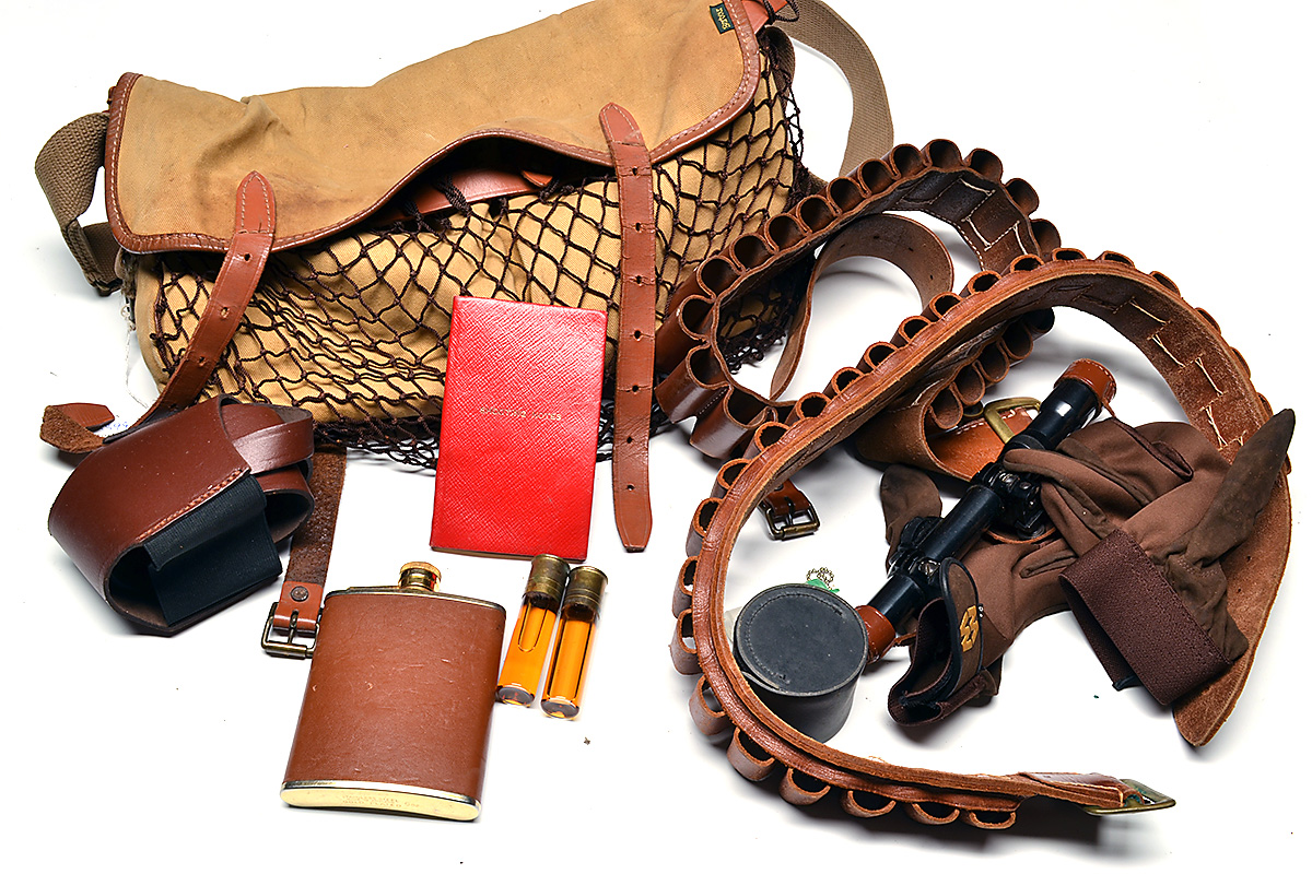 A COLLECTION OF SHOOTING RELATED ITEMS, canvas and leather game bag, containing an assortment of accessories including cartridge belts, Optikon scope, flask & cups, 2 x leather cartridge belts, gloves,