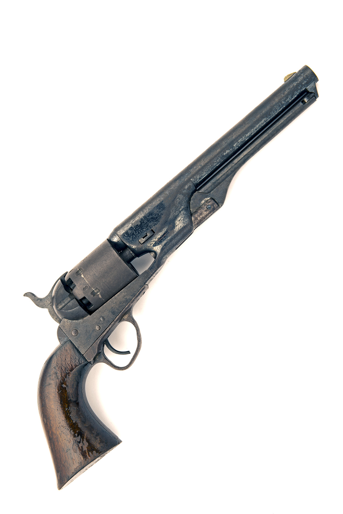for 1864, with London proved round 7 1/2in. barrel, nickel blade fore-sight, the top of barrel signed 'ADDRESS COL SAML. COLT NEW-YORK U.S. AMERICA', plain cylinder with traces of roll engraved scene, open iron frame marked 'COLT'S PATENT', iron grip-straps and trigger-guard (trigger bow deformed), smooth walnut grip and creeping under-barrel rammer, all matching numbers, each number additionally stamped with a letter 'L' above or below, strong traces of blued finish to barrel, remainder darkly stained