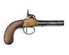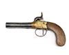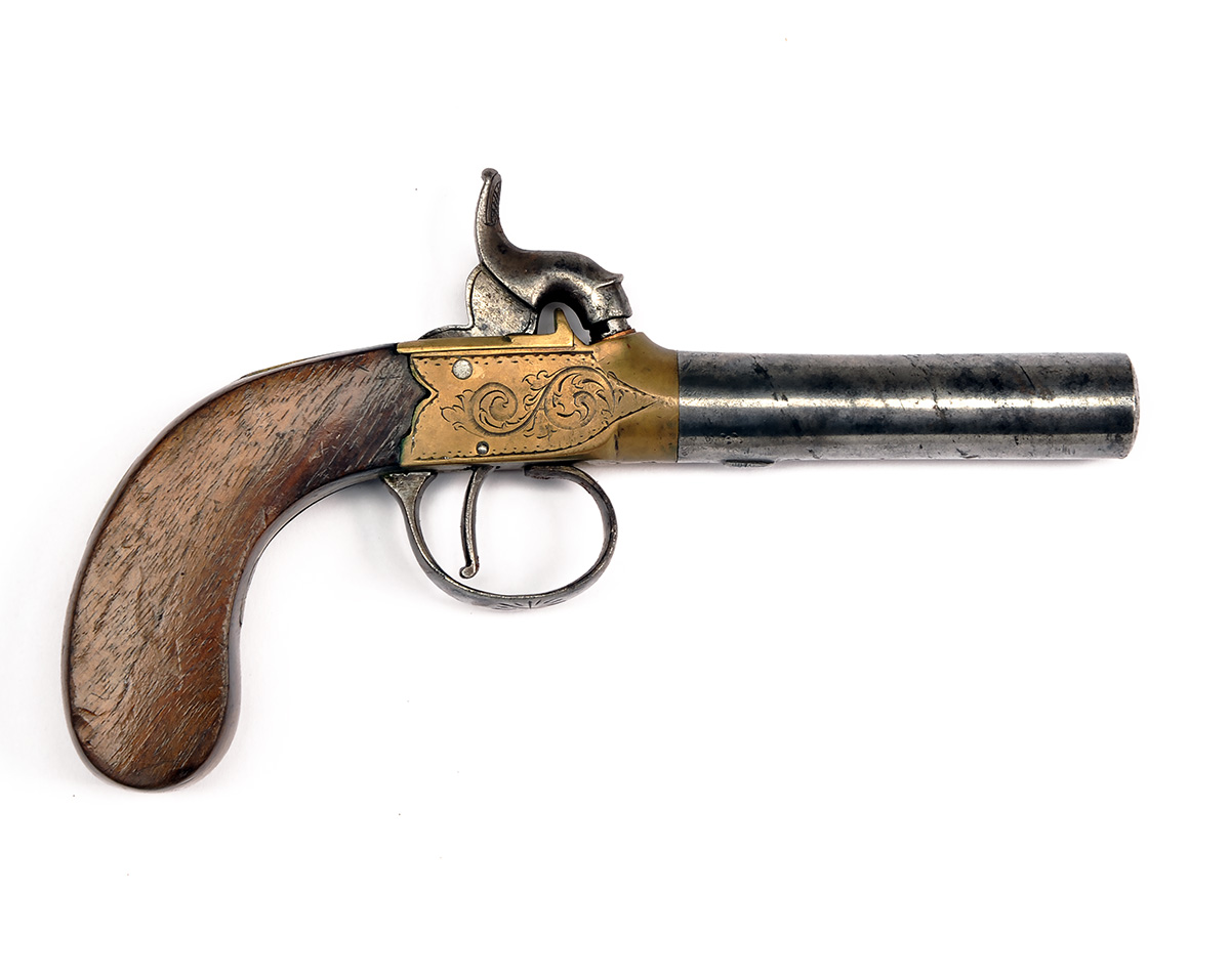 A 50-BORE PERCUSSION BRASS-FRAMED BOXLOCK POCKET PISTOL, UNSIGNED, no visible serial number, circa 1840, with Birmingham proved turn-off round 3in. barrel, engraved brass action with central hammer and guarded trigger and walnut slab-sided grip