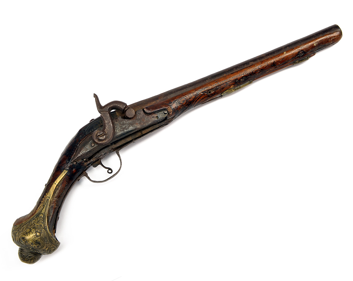 AN 18-BORE PERCUSSION HOLSTER-PISTOL, UNSIGNED, no visible serial number, Turkish circa 1790 and converted to percussion via drum and nipple, with 12in. barrel, heavily bevelled lock, moulded brass and iron furniture and walnut full-stock, poor condition with losses throughout