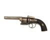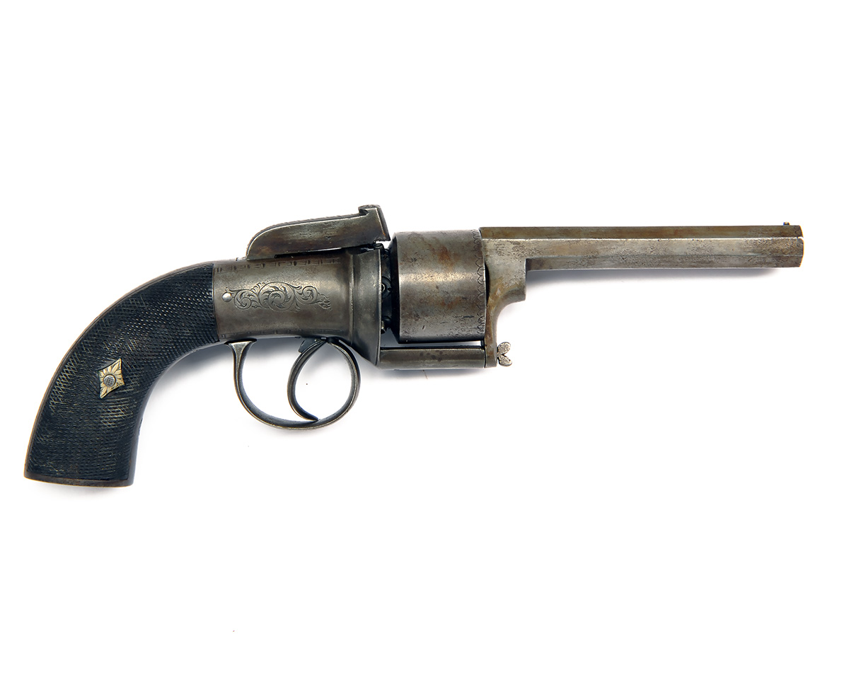 A 60-BORE PERCUSSION TRANSITIONAL REVOLVER, UNSIGNED, MODEL 'IMPROVED REVOLVER', no visible serial number, English circa 1850, with octagonal 4 1/2in. barrel, plain cylinder, open iron frame, rounded scroll engraved action with central bar-hammer and chequered walnut grips