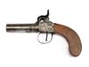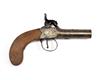 A 32-BORE PERCUSSION BOXLOCK POCKET-PISTOL SIGNED EGG, LONDON, no visible serial number, with Birmingham proved round iron 2 1/4in. turn-off barrel (frozen), engraved signed central-hammer action with guarded trigger and slab-sided walnut butt