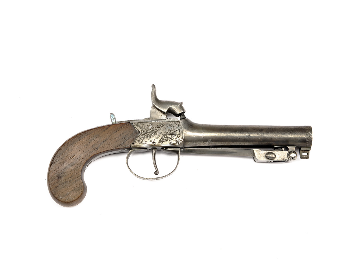 A 40-BORE PERCUSSION POCKET-PISTOL WITH SPRUNG BAYONET SIGNED BLANCH, LONDON, no visible serial number, circa 1830 but possibly converted from flint, with false rifled round turn-off 3 1/2in. barrel, sprung bayonet beneath, engraved and signed central hammer action, walnut slab-sided butt, the bayonet released by the trigger-guard