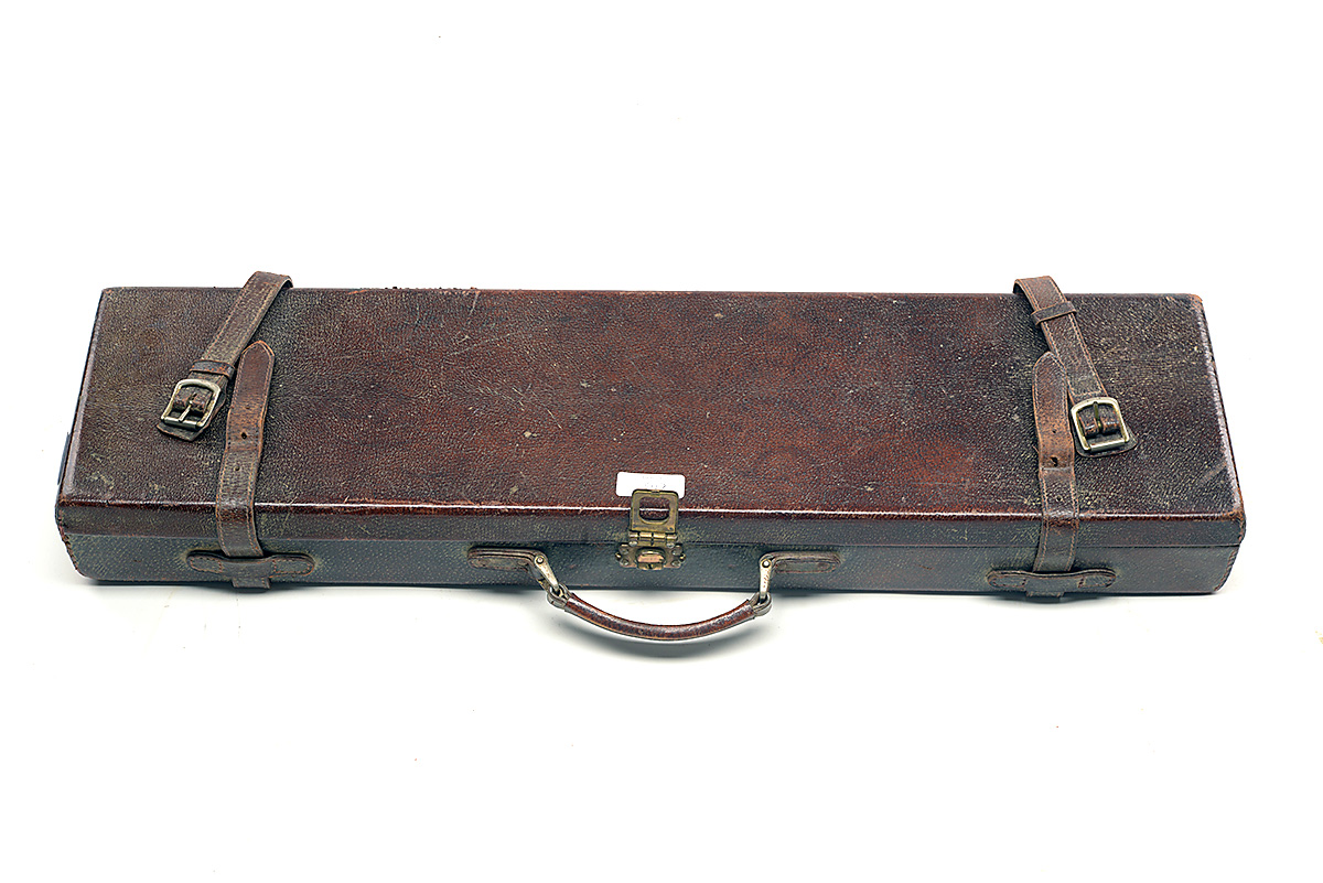 A LEATHERETTE SINGLE GUNCASE, fitted for 30in. barrels, the interior lined with green baize,