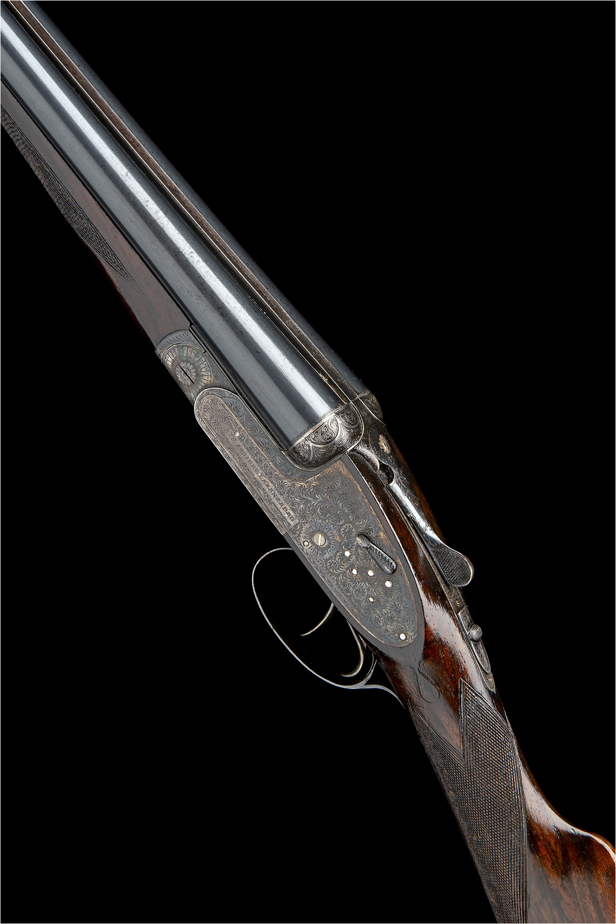 26in. nitro chopperlump barrels, 2 3/4in. chambers, bored approx. imp. cyl. and 1/2 choke, engraved arcaded fences, removable striker discs, automatic safety, hand-detachable lockplates, gold-inlaid cocking-indicators, rolled-edge triggerguard, fully engraved with acanthus scrollwork, retaining much original colour-hardening and finish, 14 3/4in. figured stock, weight 5lb. 14oz.