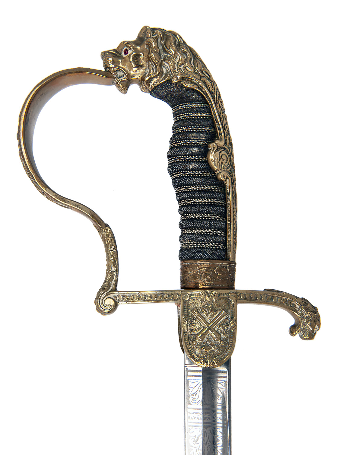 circa 1890, with slightly curved narrow 30 1/2in. plated blade etched for the first half with scrolls and trophies within an arabesque border, broad fuller to both sides for the first three fifths of its length, makers mark at forte (obscured by the langet), cast and carved brass hilt with broad langets, one with crossed cannon the reverse with a vacant shield, lionshead turned down quillion, 'P' shaped knuckle-bow, wire bound ribbed sharkskin grip with lionshead pommel inset with red glass eyes, the backstrap, reinforcing ears and collar carved with oakleaves and complete with its black painted iron scabbard