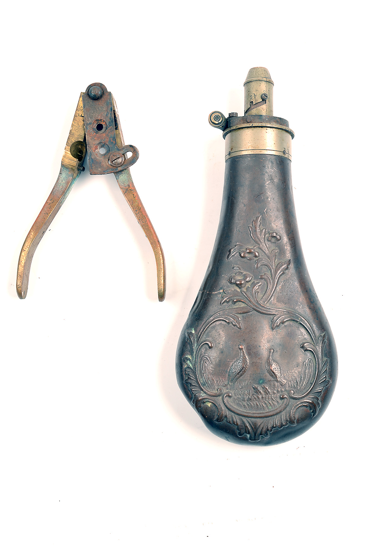 A VINTAGE SHOTGUN POWDER-FLASK AND A REPRODUCTION COLT .44 DOUBLE CAVITY MOULD, the first circa 1860 (mainspring replaced) and embossed with a panel of pheasants, the second brass and marked 'Made in Italy' (2)