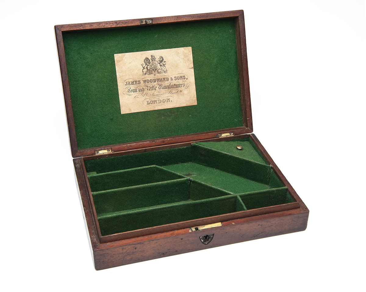 A VINTAGE WALNUT PISTOL-CASE WITH JAMES WOODWARD LABEL,