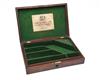 measuring externally 11 3/4in. x 7 3/4in. x 2 3/8in, lined and compartmented in green baize, parchment label to inside of lid (possibly reproduction) and suitable for a muzzle-loading revolver, central lock to front missing its shield-shaped escutcheon and key