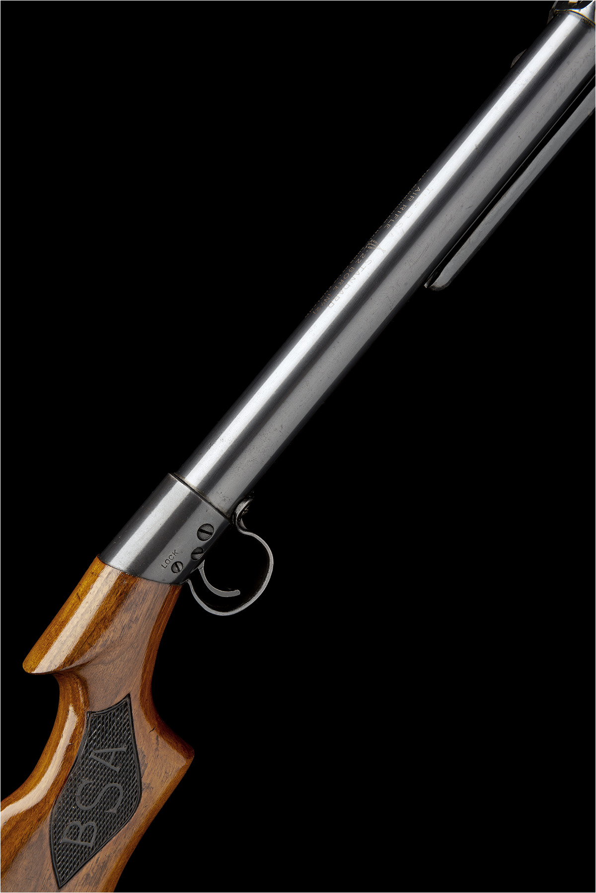 for 1937, with 19 1/4in. sighted barrel, the blade fore-sight retaining rare fore-sight protector, loading tap at breech, plain air chamber etched with make, model details and three lines of patents, three hole trigger-group, walnut saw-handled butt-stock with press-chequered grip-panels incorporating the BSA trademark, no provision for fore-end and push-button under-lever, the whole remaining in outstanding condition and appearing little used