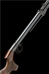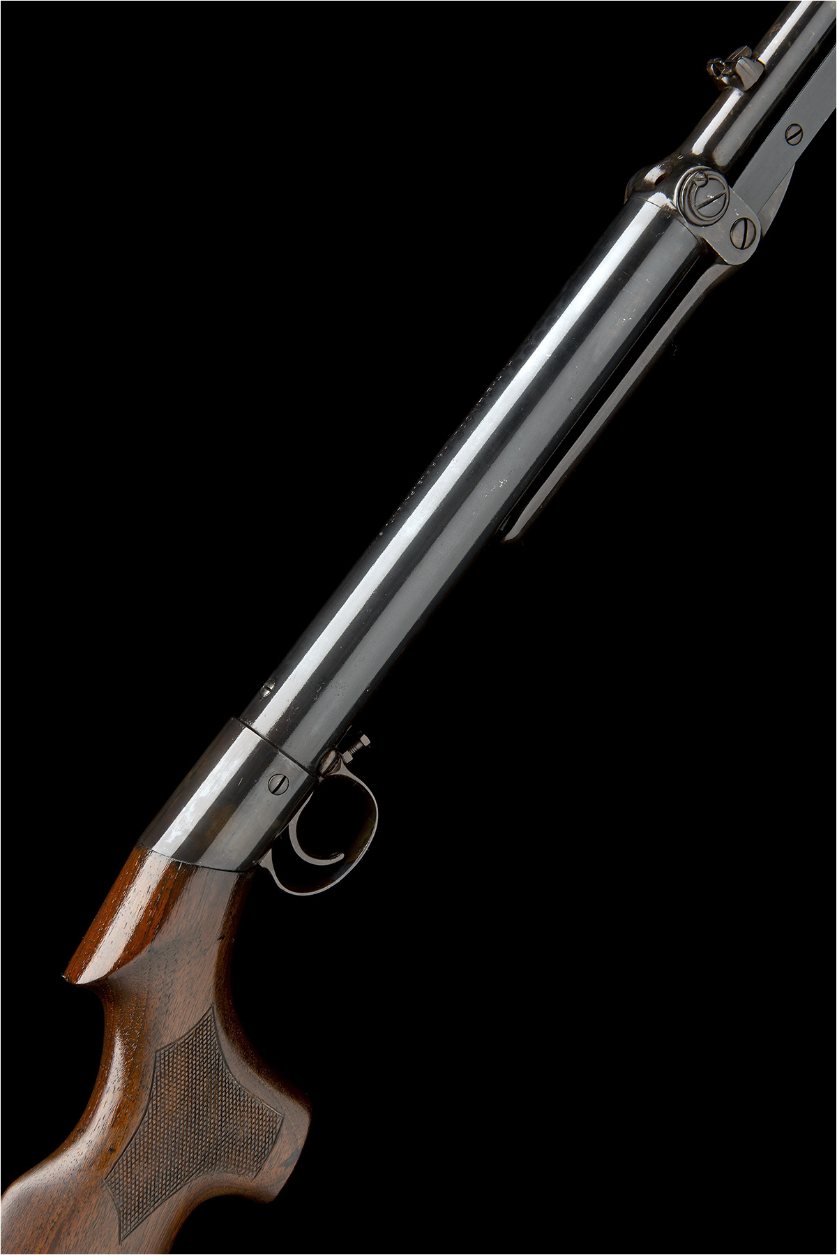for 1908, with 19 1/4in. blued barrel, dove-tailed fore-sight, elevating notch rear-sight, tap load at breech fixed with a side screw, the top of air-chamber stamped 'H. THE LINCOLN AIR RIFLE. PATENT, 8761/04' and fitted with rare locking screw at rear of chamber, single pin trigger block, chequered walnut saw-handled butt-stock with maker's address details, iron heel-plate, no provision for fore-end and 'spade' catch under-lever, expertly refinished throughout