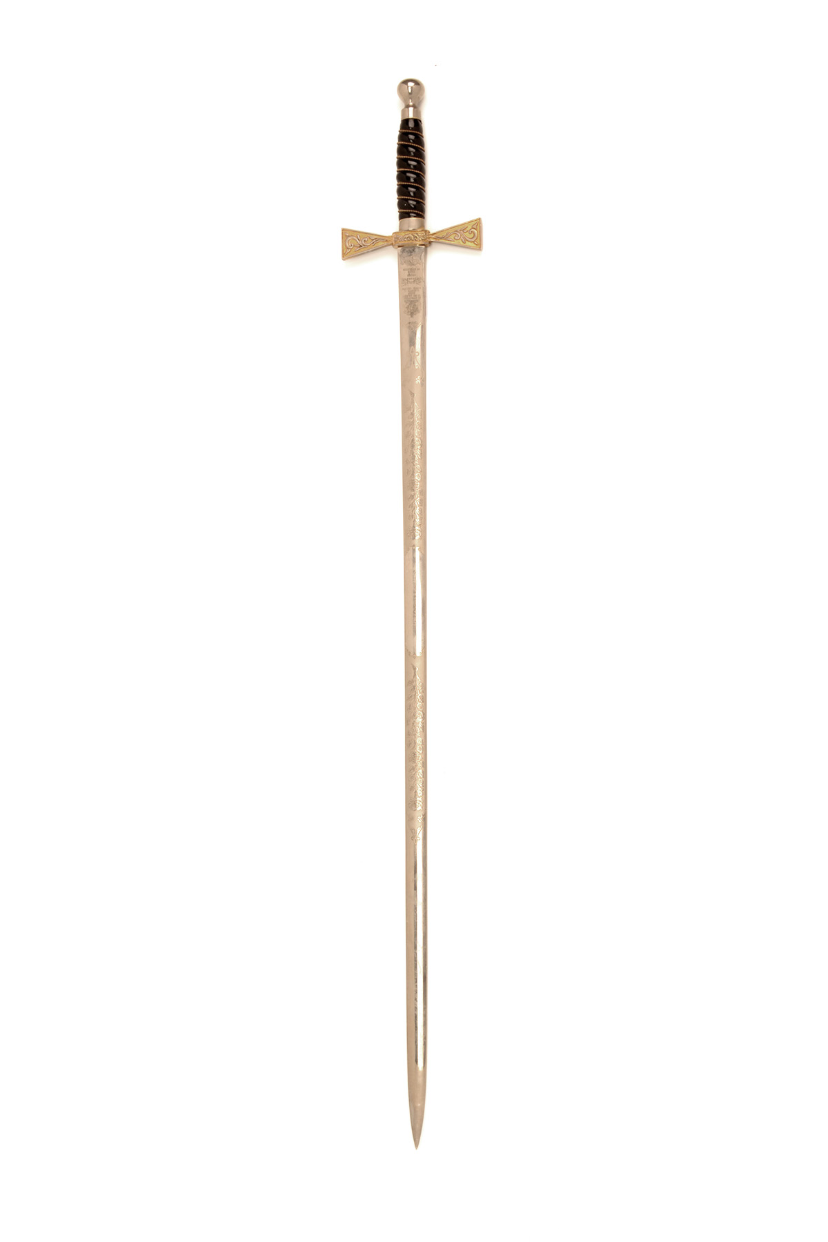 A MASONIC SWORD SIGNED WILKINSON, LONDON, mid to late 20th century, with straight etched 30in. blade, flared crossguard carved with foliage (traces of gilt), wire bound black celluloid grip and plain bulbous pommel, no scabbard
