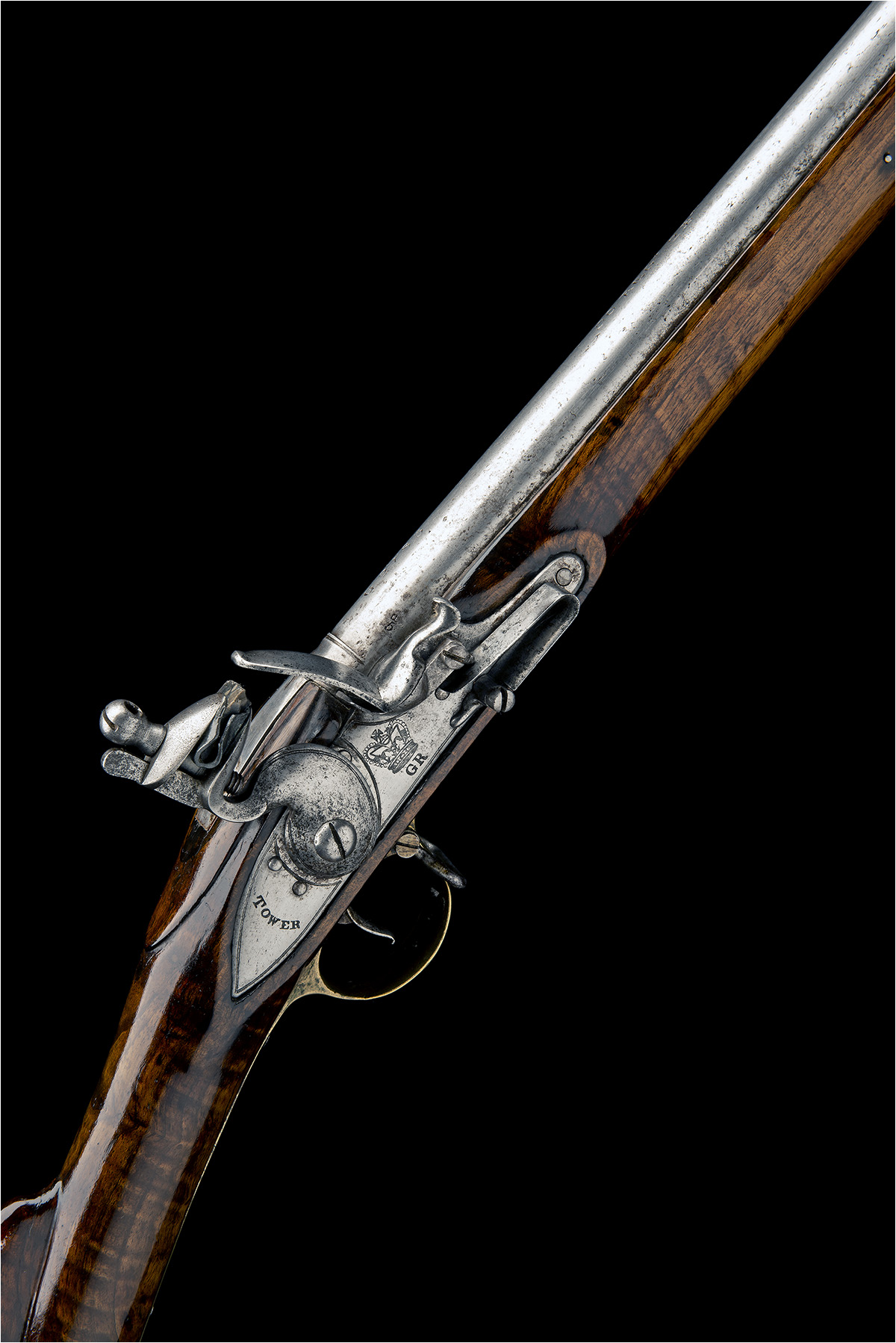 circa 1795, with brushed bright 39in. iron barrel, the top with the registration number for Co. Galway and also marked '90 REGT 2BN' (Cameronians, but possibly spurious), block fore-sight, moulded band at breech, solid top-tang, borderline engraved lock signed 'TOWER' at the tail and marked with a crown and 'G.R.' device below pan, walnut handrail stock with carved apron around the top-tang, brass furniture including heel-plate, 'L' shaped sideplate, trigger guard bow and ramrod pipes and fitted with an iron ramrod and stirrup swivels
