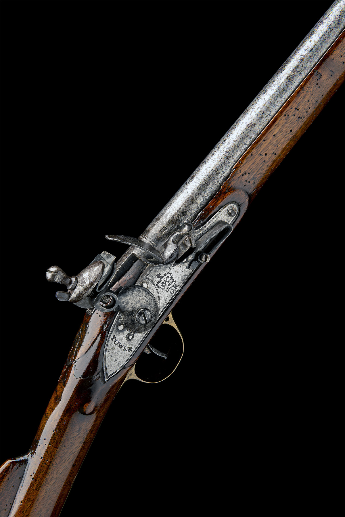 circa 1800, with in the white 39in. iron barrel, bead fore-sight, moulded band at breech, solid top-tang, borderline engraved lock signed 'TOWER' at the tail and marked with a crown and 'G.R.' device below pan, walnut handrail stock (extensive treated worm, cracked through and repaired behind lock and holed below fore-end) with carved apron around the top-tang, brass furniture including heel-plate, 'L' shaped sideplate, trigger guard bow and ramrod pipes and fitted with a replacement iron ramrod